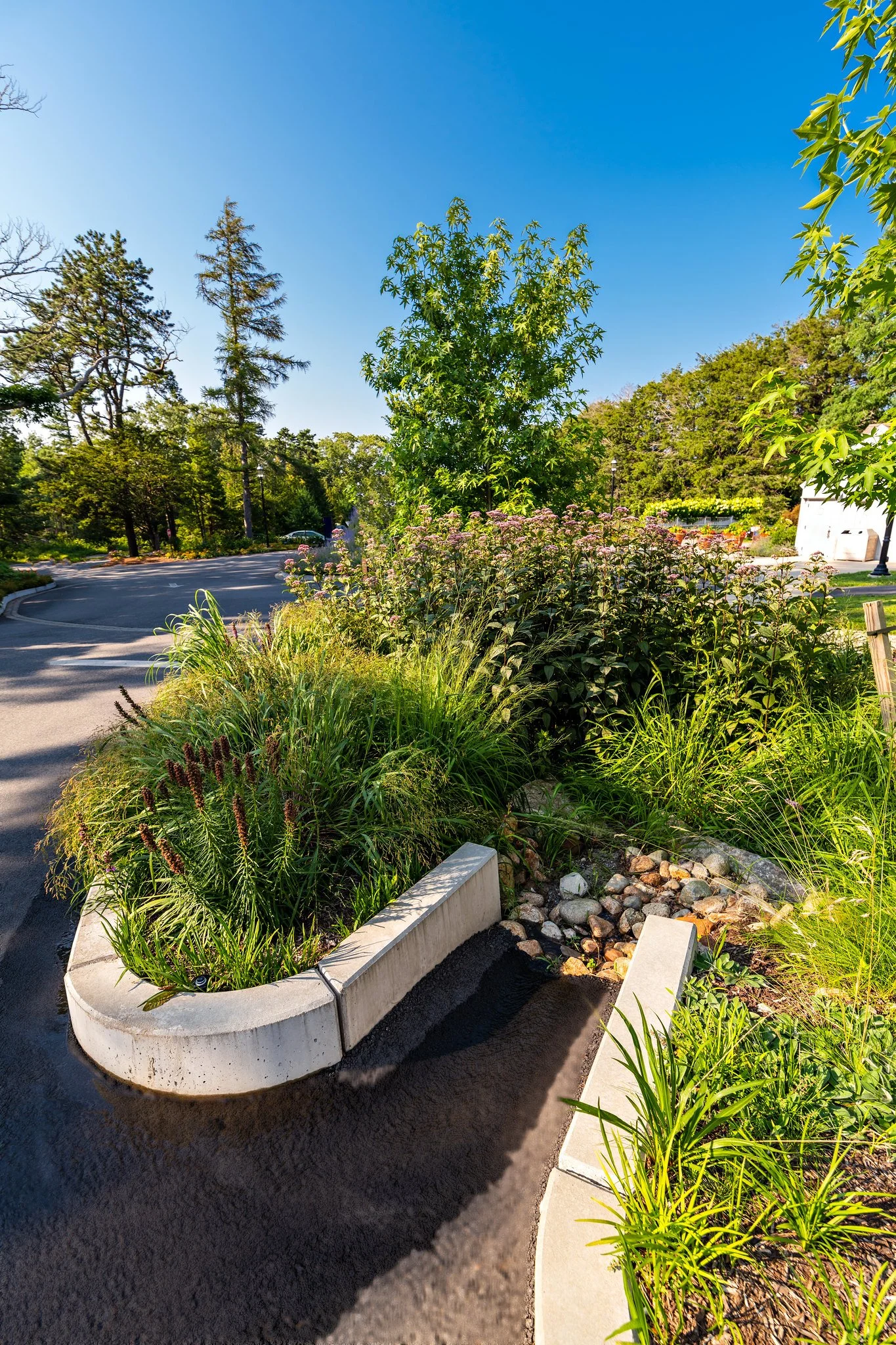 Plants are an important component to these types of systems. They work to maintain healthy soil /filter media, absorb excess pollutants, help mitigate heat island effect, and soak up excess water, releasing some of it through transpiration. On top of this, the conditions are typically difficult with excess salts when near parking lots and large swings between inundated and drought conditions. Selecting the correct plant material should take all of these constraints into consideration, along with typical planting factors such as sun exposure and depth of inundation during rainfall events.